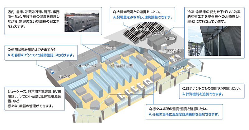 DESSは商業施設、飲食店、工場、倉庫などビジネス拠点におけるデマンド・省エネ制御を遠隔で一括管理できるソリューションです。空調機/冷蔵冷凍機/水道/太陽光発電/温湿度監視・制御など、お客様、商品、従業員に最適な環境を提供しながらも効率の良いエネルギー利用を実現します。